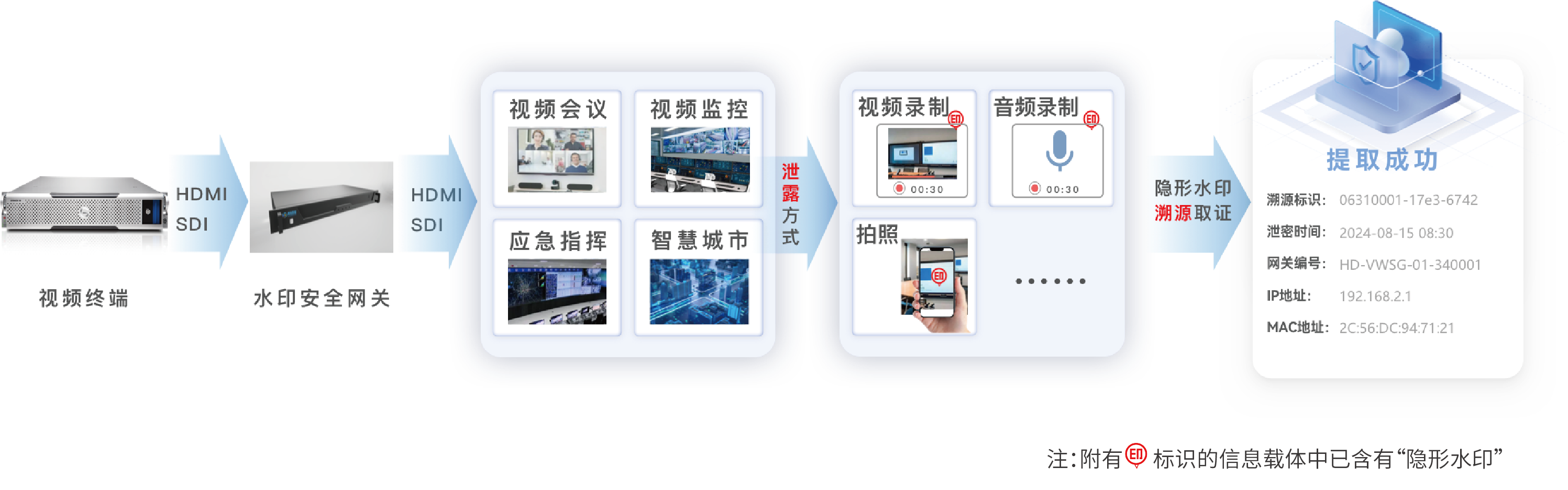 連接于視頻會議終端與會議大屏之間,一旦視頻會議被錄像、拍照、錄音,造成視頻會議泄密傳播,可通過泄密內(nèi)容溯源到會議單位、會議室和錄制時間。