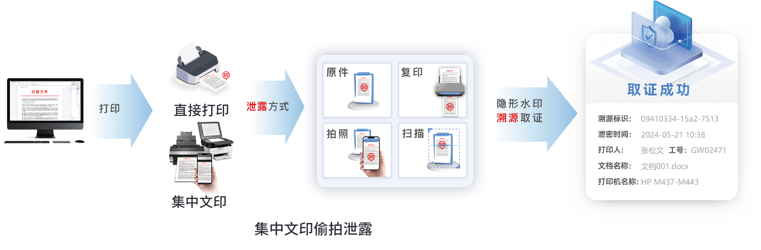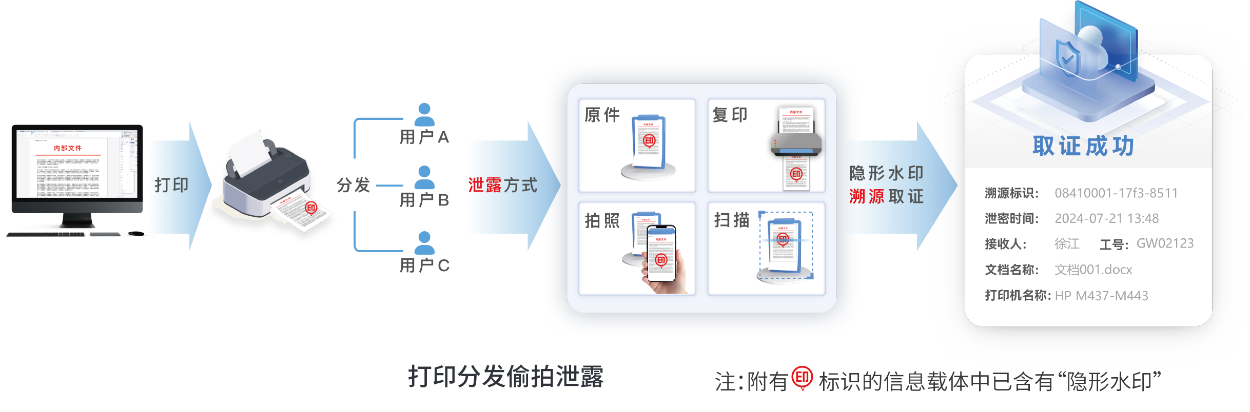 系統(tǒng)主要解決打印文件被偷拍、復(fù)印、掃描導(dǎo)致的數(shù)據(jù)泄露問題。產(chǎn)品在打印輸出的文檔文字中隱藏?zé)o感知的溯源信息,對泄露的打印件、復(fù)印件、掃描件、照片等進行溯源信息的提取,精準(zhǔn)定位紙質(zhì)文件泄露源頭,實現(xiàn)對紙質(zhì)文檔打印、復(fù)印和拍照行為的安全管理。